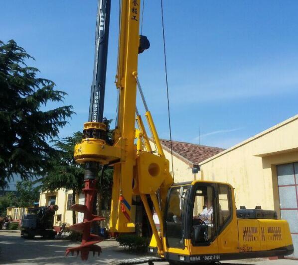 螺旋桩机主要由动力头,钻杆,立柱,液压步履式底盘、回转结构、卷扬机、操作室、电器系统、液压系统、托运机构等组成。在工作状态下,通过操纵液压系统,可实现行走、回转、起落立柱及桩机对位。工作时由动力头驱动钻杆、钻头旋转、卷扬机控制钻具的升降,被钻切削下的土料由螺旋片输送到地面。钻至设计深度提钻成孔,根据工法要求也可边提钻边压注混凝土(或泥浆)而成桩。